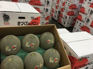 日本海に沈む夕日をデザインしたJAごしょつがるの「きづくりメロン」は、白地にオレンジというインパクトのあるカラーリングで、卸売場の中でもひときわ目を引く存在でした。