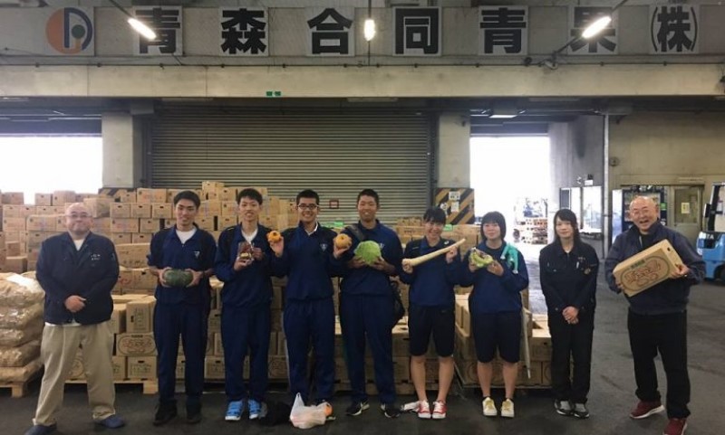 南高校OB職員との昼食懇談、青果物流通の仕組みと卸売市場の役割についての講義、仲卸組合および商業協同組合役員との懇談、市場施設の見学と盛りだくさんの内容をこなし、お土産の梨と柿を持って雨の中を歩いて帰っていきました。