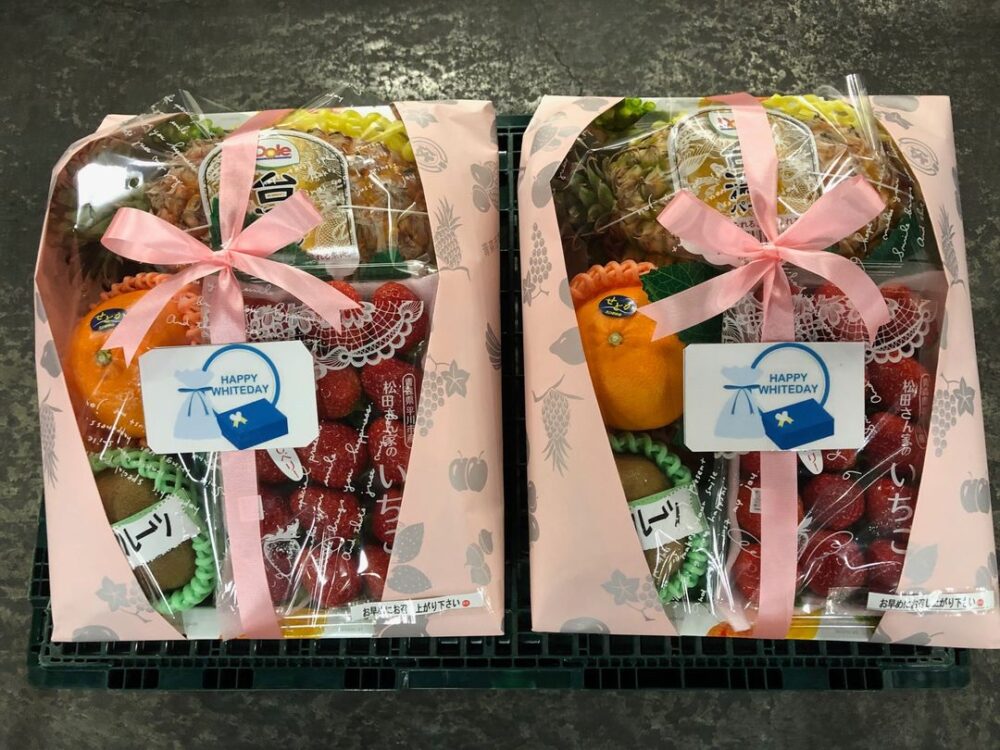ホワイトデー スポンサードリンク 市場便り X Facebook はてブ LINE Pinterest コピー 2023.03.152023.11.08 目次 ホワイトデー 青森合同青果株式会社 ソーシアルメディアで青果物流通 ホワイトデー ホワイトデー用のフルーツギフト 青森市本町の果実専門店中傳本店さんに作ってもらったホワイトデー用のフルーツギフト。 ここ数年ホワイトデーで果物をプレゼントされる方が増えているようです。 ギフトをご用命の際は、事前にお電話でお問い合わせいただきたいとのことでした。
