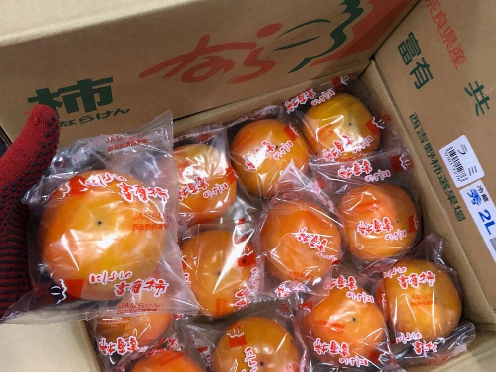 画像はJAならけんの西吉野産の冷蔵富有柿。軟果を防ぐため1個ずつポリエチレンの袋で包装されています。