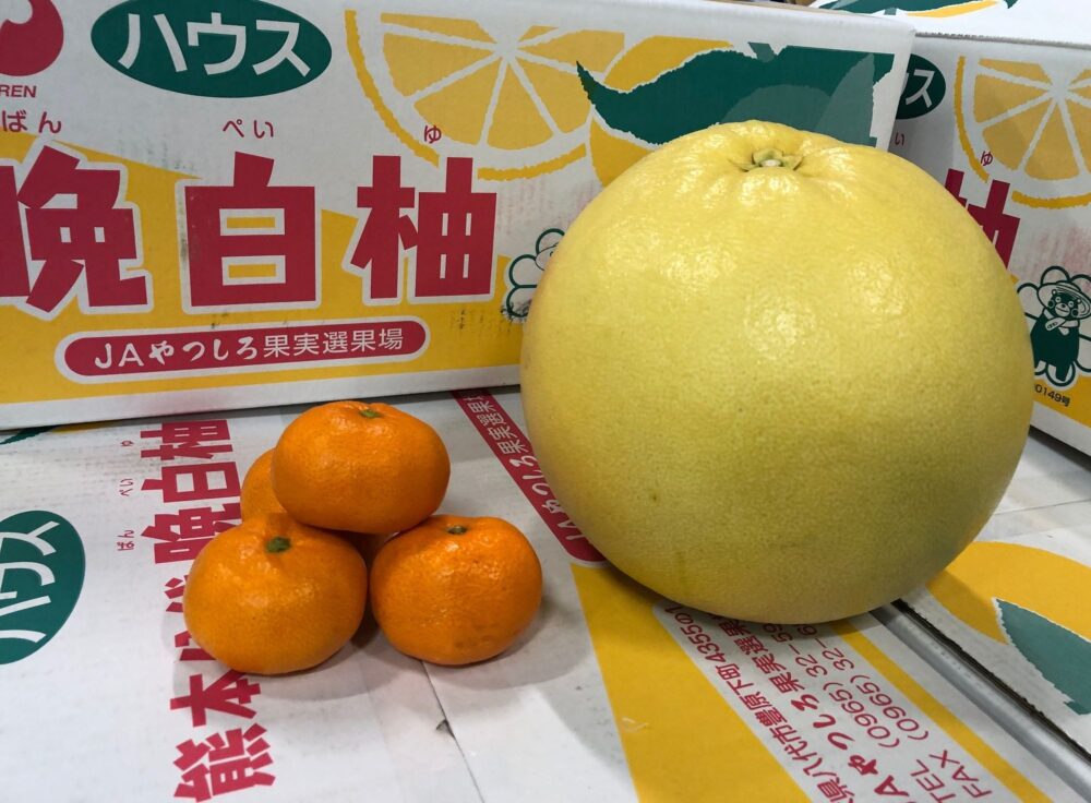 ザボンの一種の晩白柚(ばんぺいゆ)は熊本県特産のジャンボ柑橘。画像のものは約3キロ、みかん30個分です。