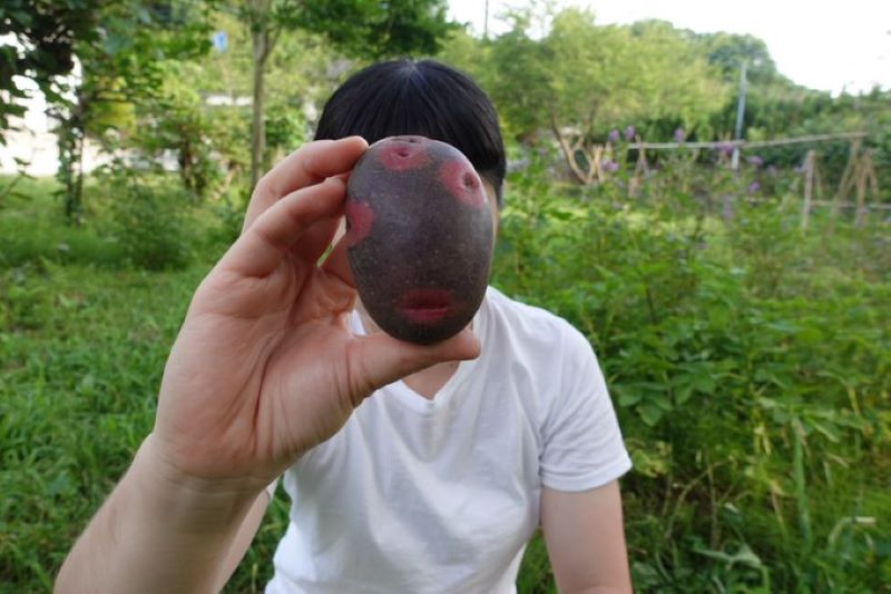 男性の農業従事者固定種・在来種の紹介女性の農業従事者 紫の皮と赤い芽のジャガイモ『デストロイヤ』。