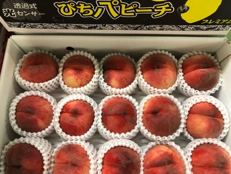 1個ずつ糖度センサーを通しているJA八戸の「ぴちぱちピーチ」、現在は中晩生種の「まどか」が入荷中。