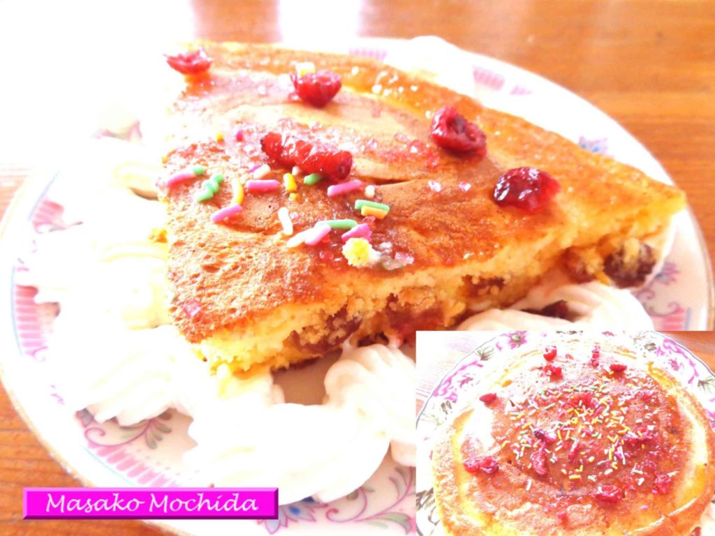 休日の夫に、久しぶりにレーズンやクランベリーなどの入ったパンケーキを焼いてみました。